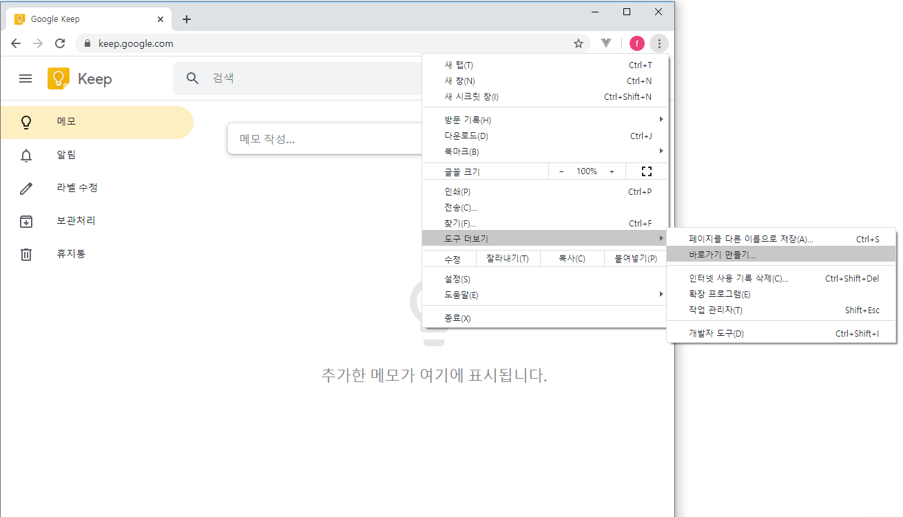 1. 도구 더보기 > 바로가기 만들기